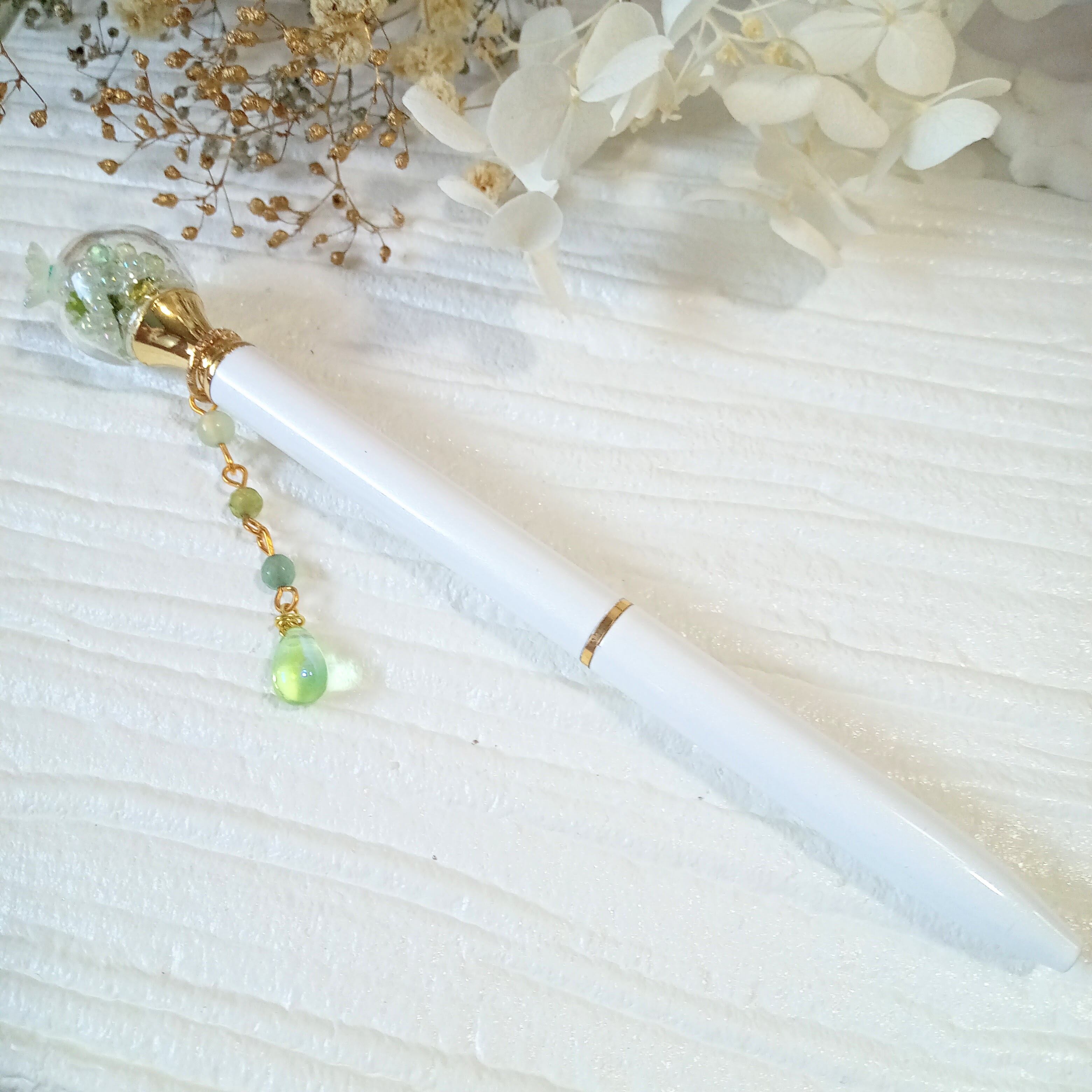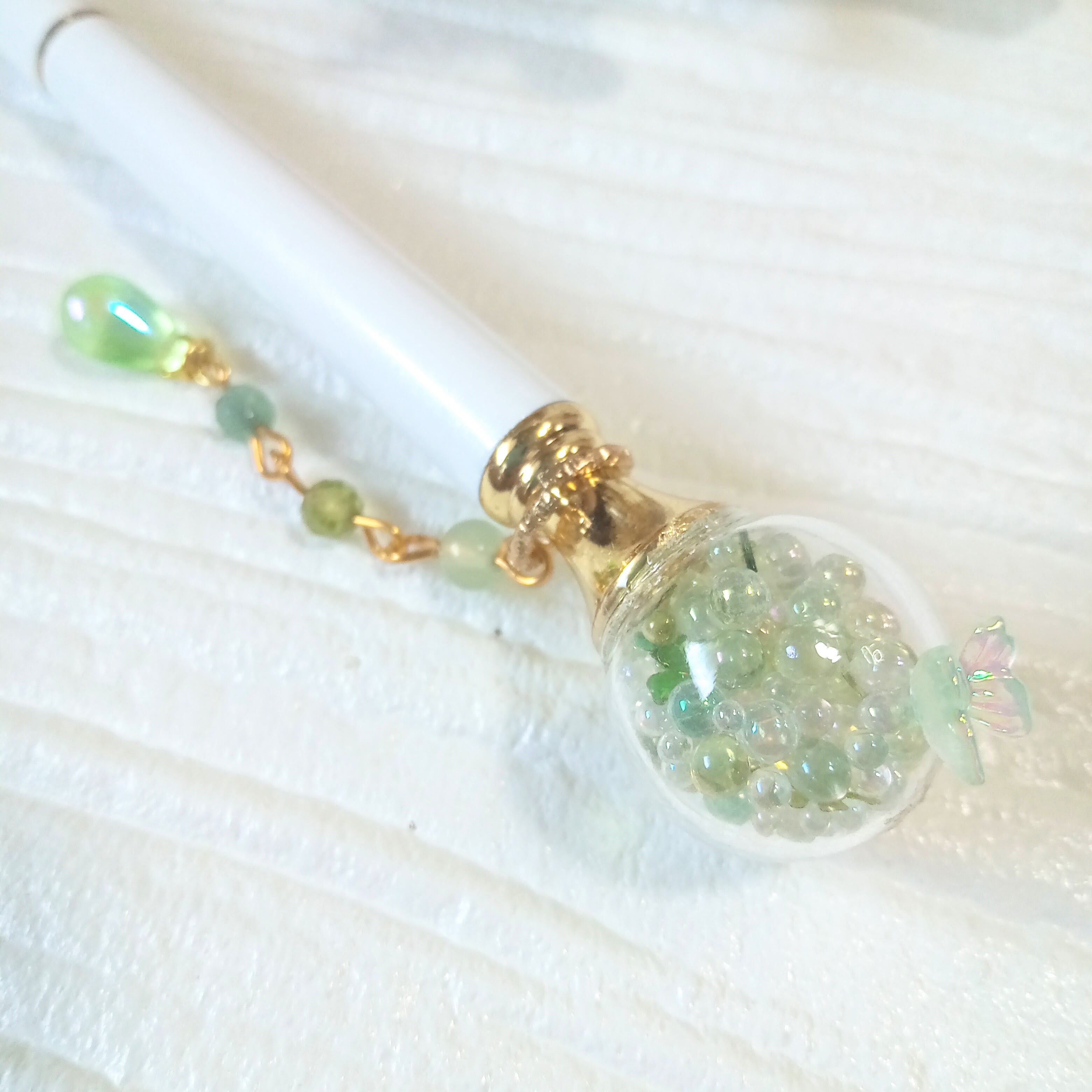 ガラスドームボールペン 繰り出し式 天然石 パワーストーン 可愛い おしゃれ プレゼント 贈り物 緑 グリーン 白 ホワイト ゴールド クローバー 蝶 バタフライ