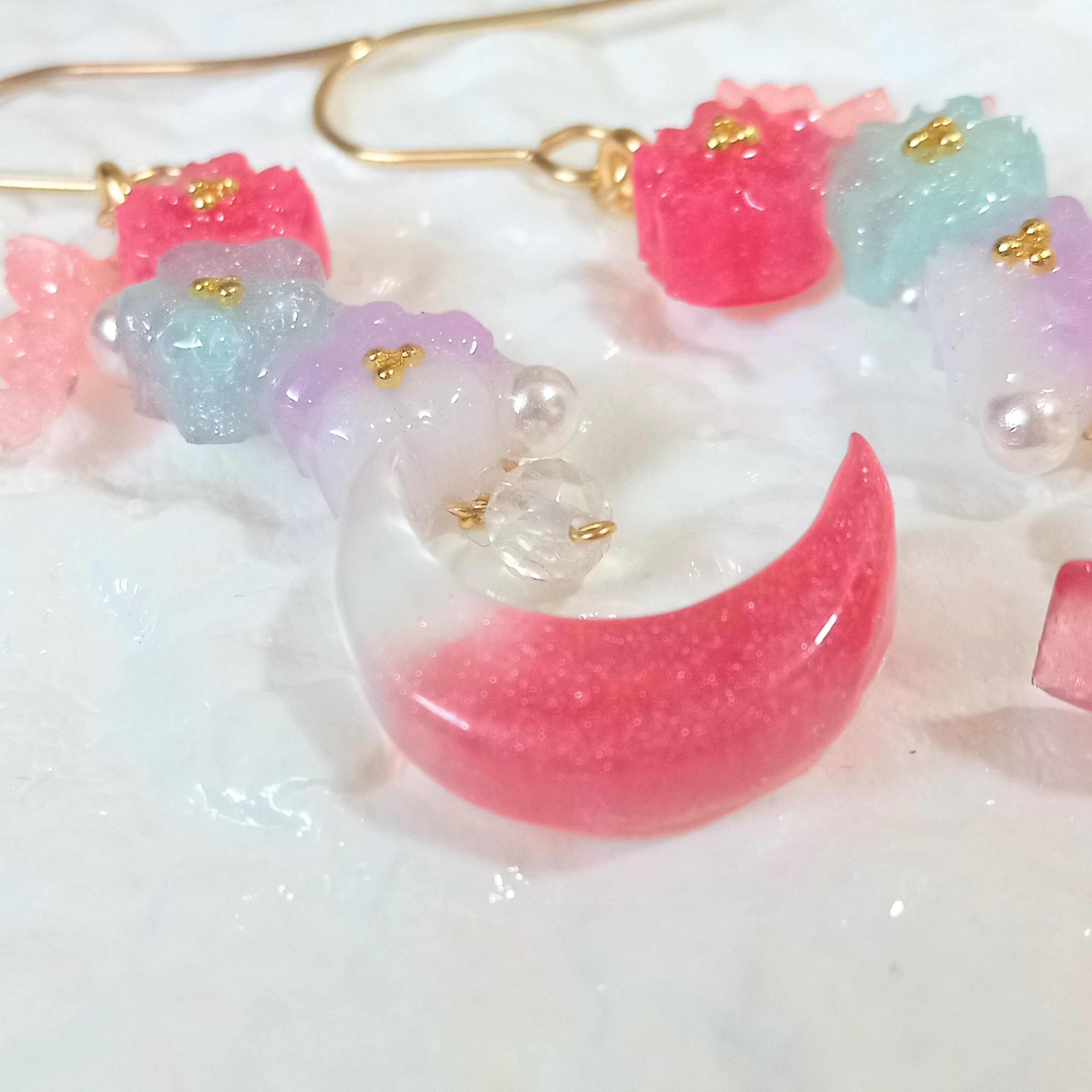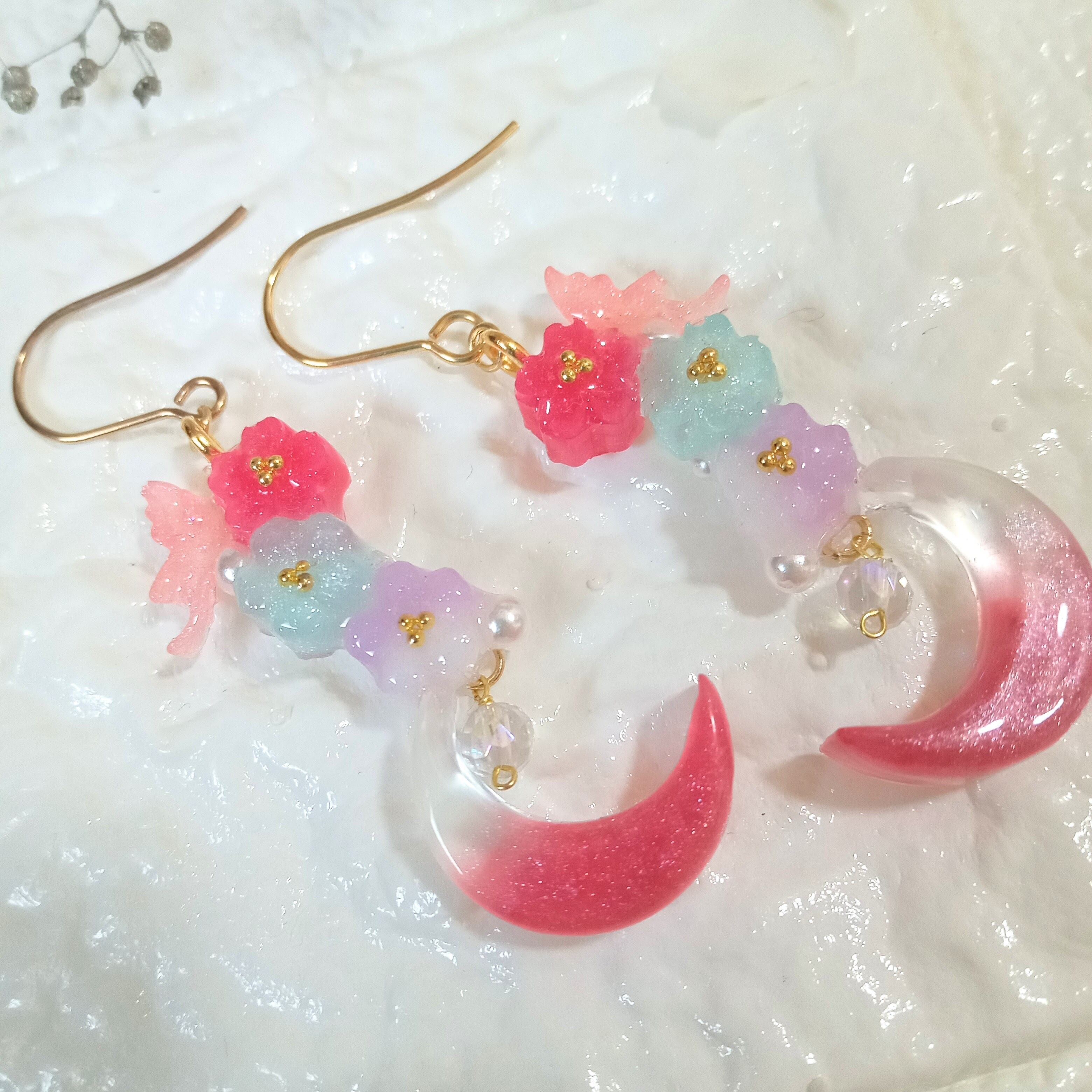 3色の花を繋いだ下に三日月と小粒の天然石が揺れる可愛さをギュっと詰め込んだアクセサリー。