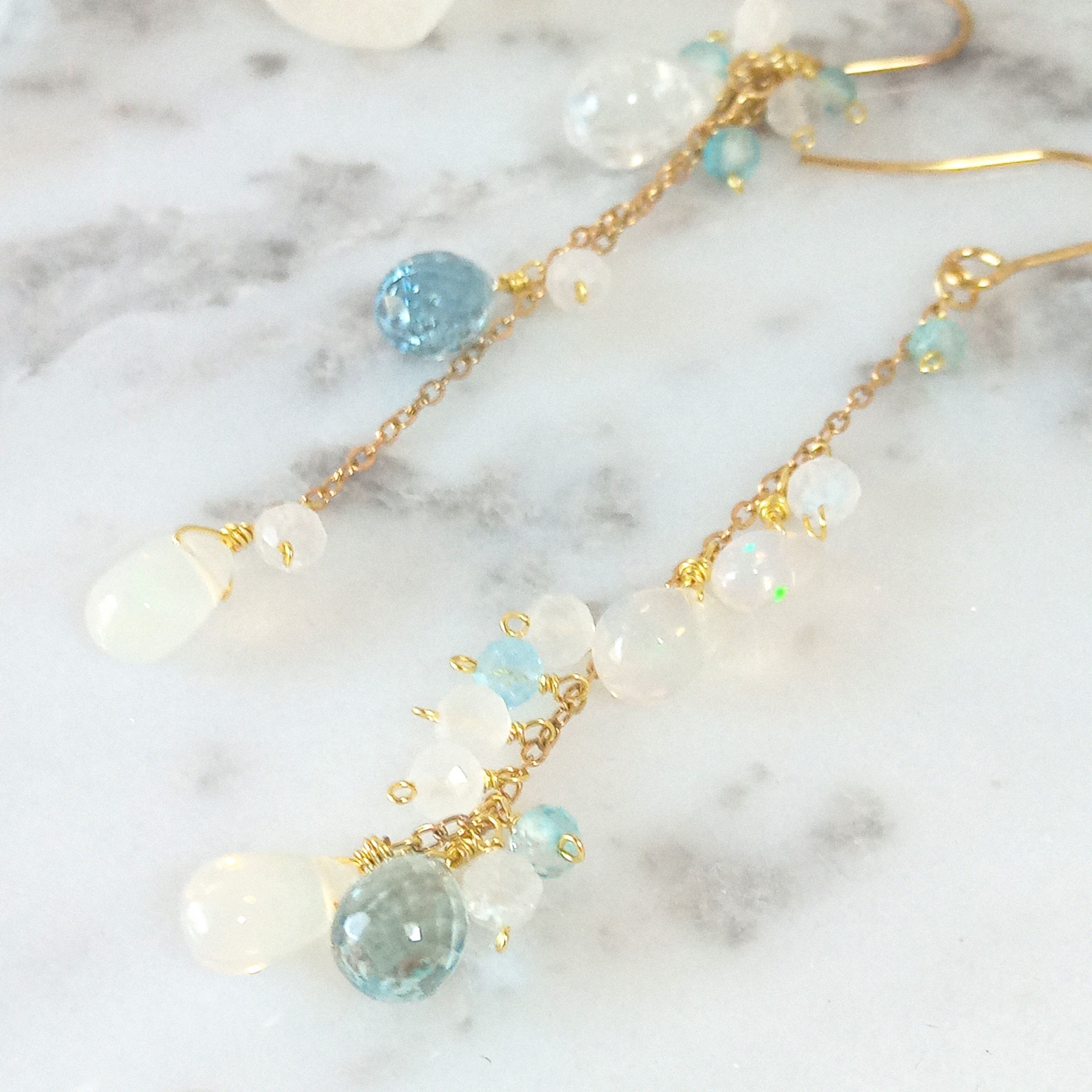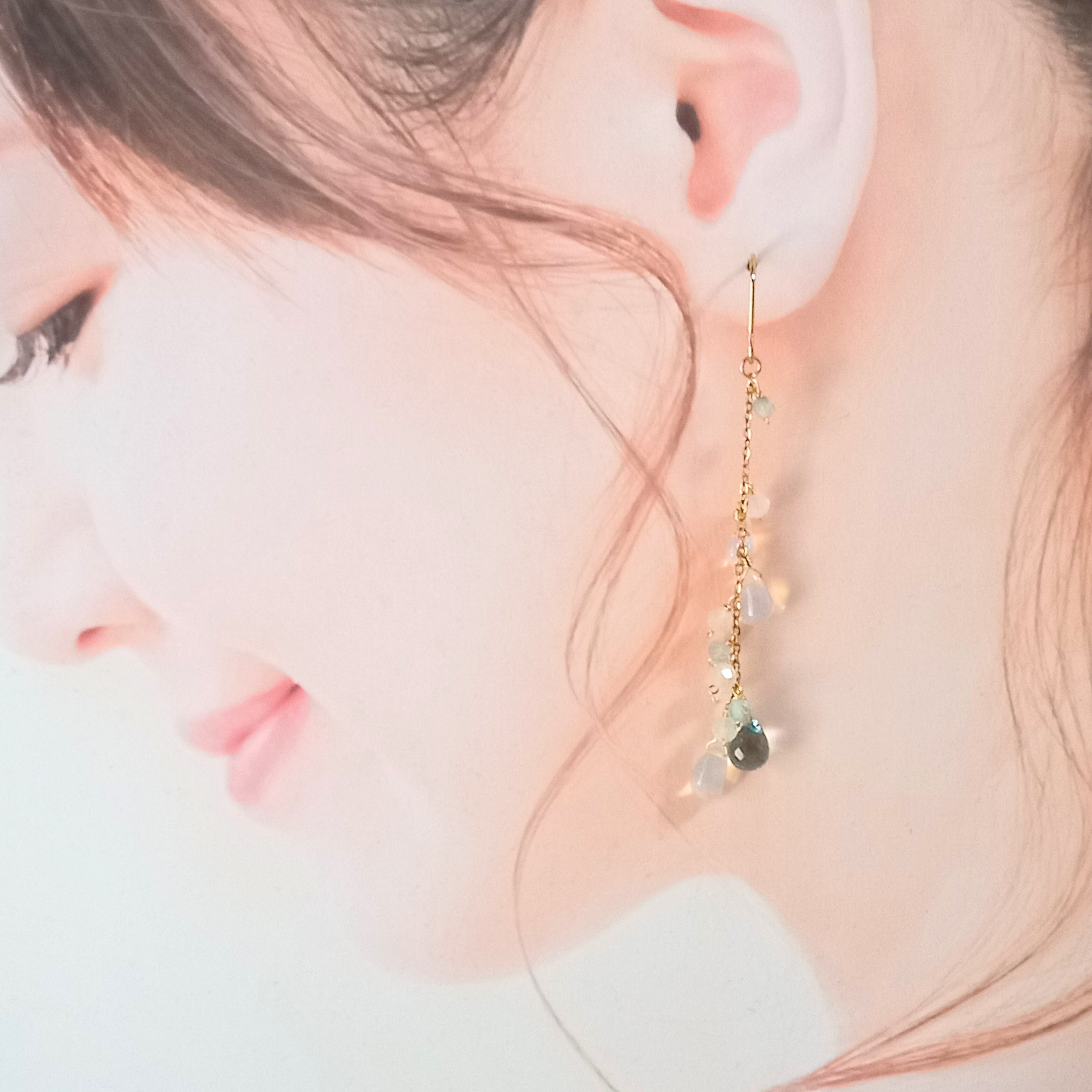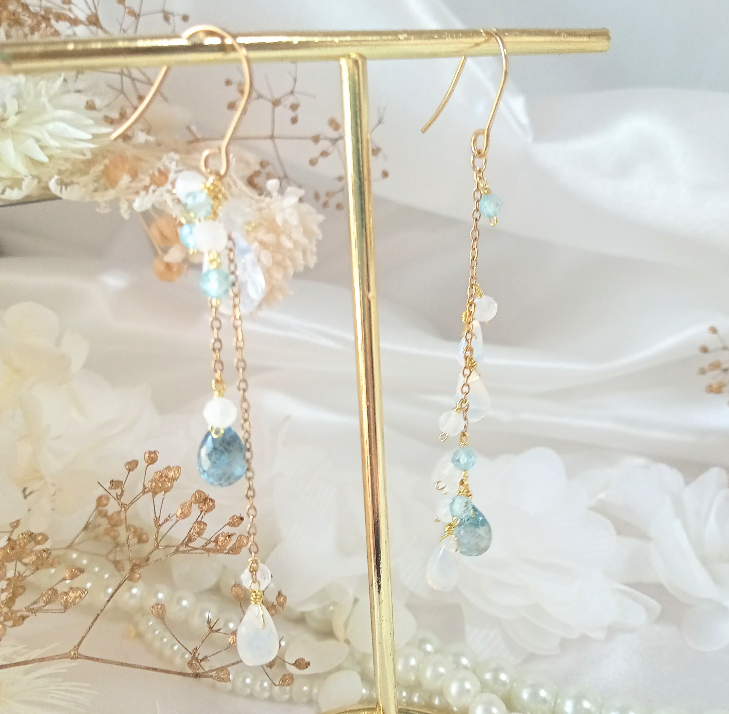高品質のサンタマリアアクアマリンを使用したアシンメトリーのロングピアスです。