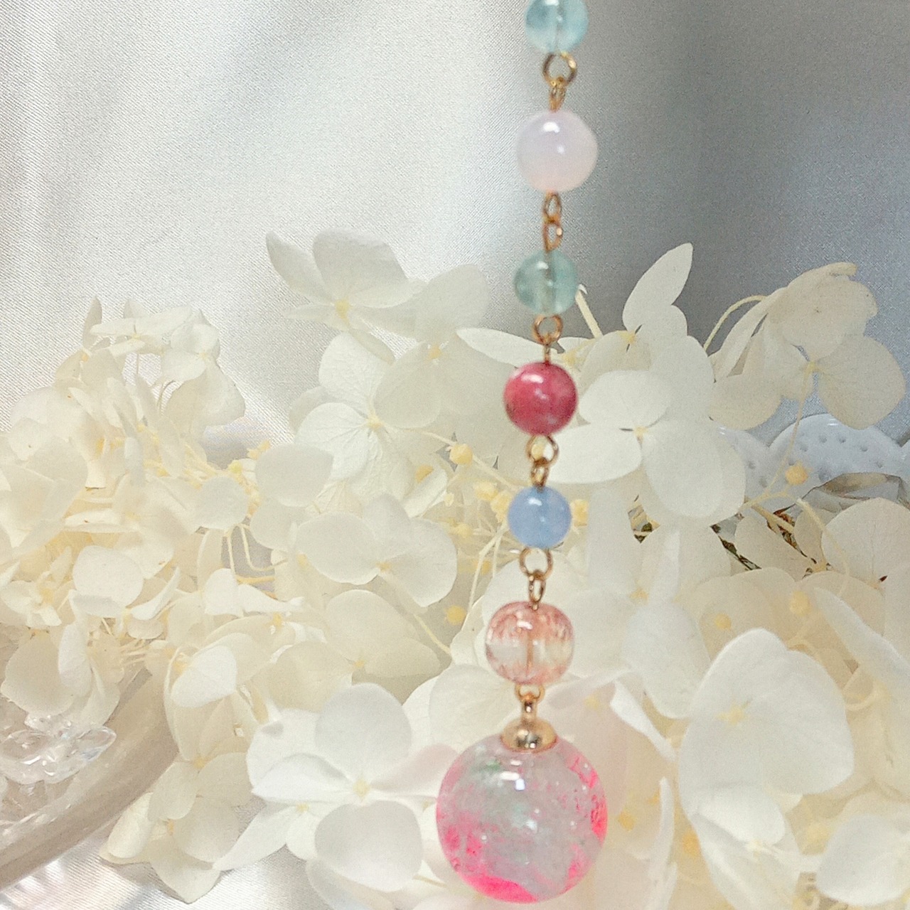 先端は紫陽花のドライフラワーをレジンで閉じ込めたチャームが付いています。