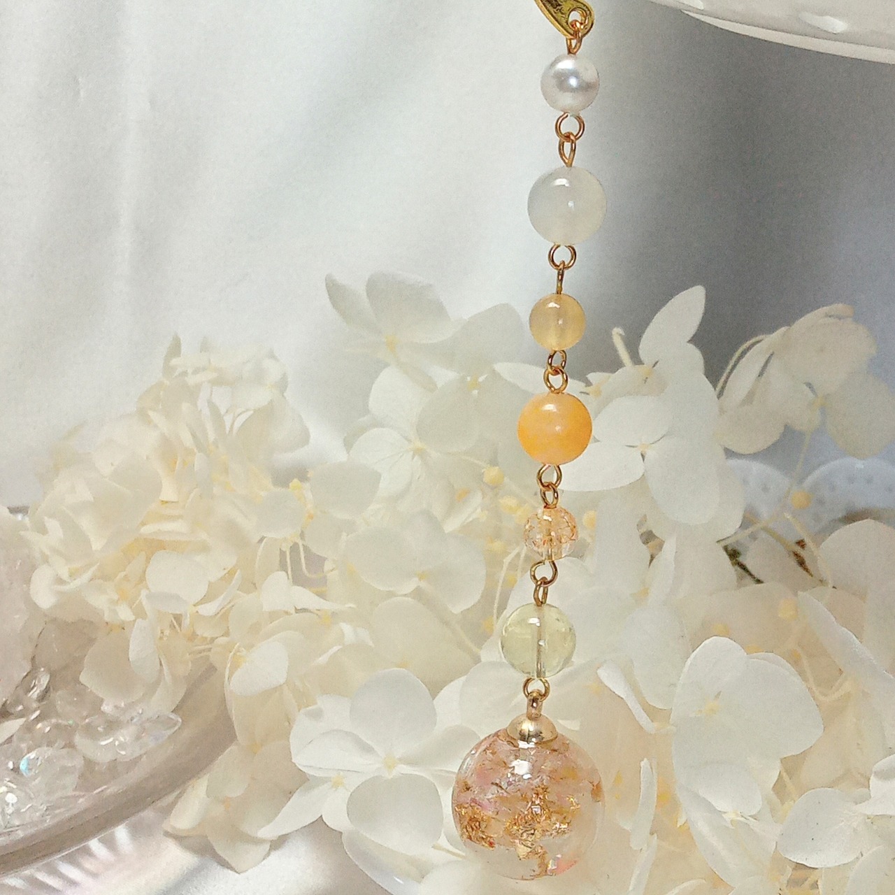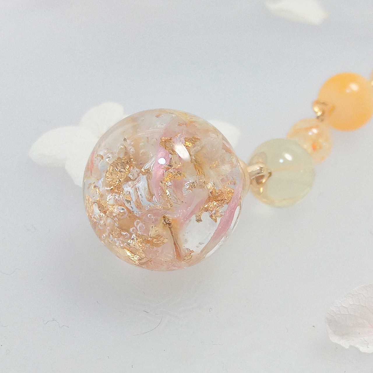 先端はローズのドライフラワーと金箔をレジンで閉じ込めたチャームが付いています。