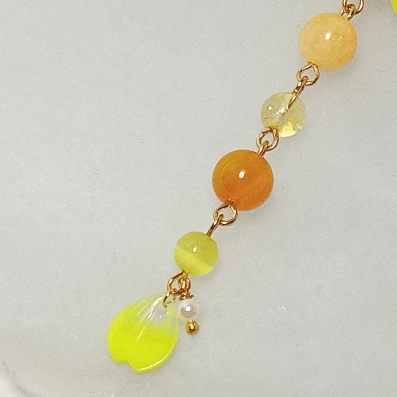 ●イエローフローライト…前向きな恋愛、充実した時間の共有、直感力アップ、成功のアイディアを得る、創造力アップ、元気を取り戻す、幸福感を高める、運気を安定させる
