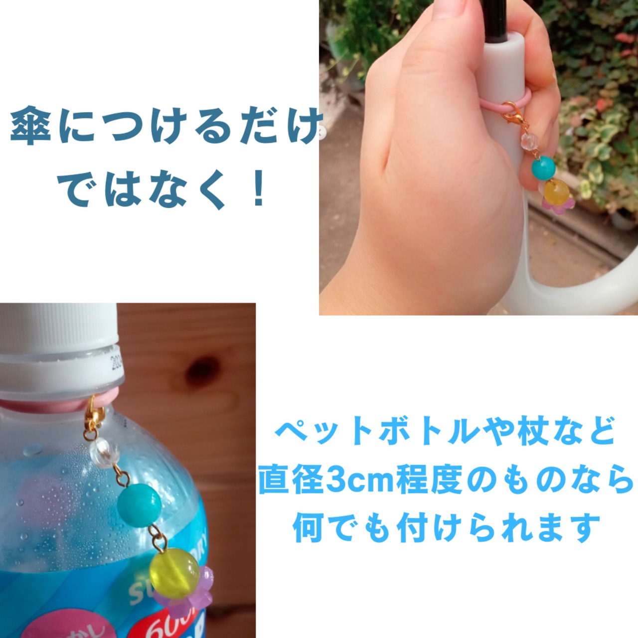 傘や杖の紛失防止や立てかけて置いたときに滑って倒れてしまうというのもアンブレラマーカーをすることで防ぐことが出来ますし、ペットボトルに付ければ、間違いなく自分の飲み物だとわかるので職場や友達とのレジャーにもぴったり。